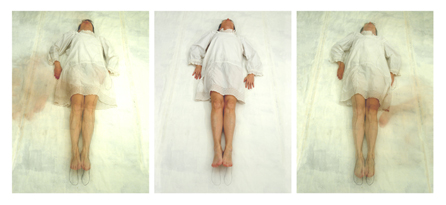 entstehen: auf dem Boden liegend, erstarrt zur Pose einer toten Frau. Im medialen Tod der Künstlerin ist