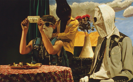 Oder sie haben viel am und im Kopf: Maske, Vase, Papiersack, wirre Ideen und Reden in Nachvertonung.